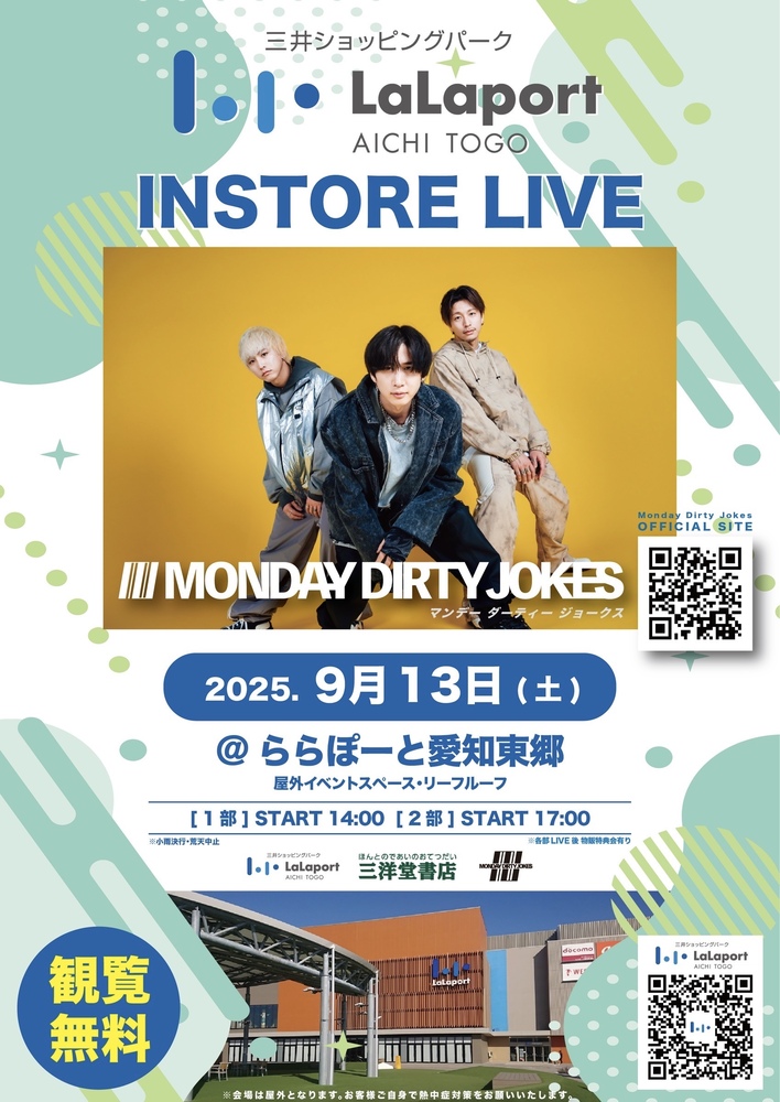 (愛知)Monday Dirty Jokes INSTORE LIVE LIVE SCHEDULE 2025/09/13(土) ららぽーと愛知東郷 地図を表示 ららぽーと愛知東郷にて MDJ単独インストアイベント開催‼️✨ / 🗓️9/13(土) LaLaport AICHI TOGO 「 Monday Dirty Jokes INSTORE LIVE 」 🕒1部 14:00〜 / 2部 17:00〜 📍ららぽーと愛知東郷 屋外イベントスペース・リーフルーフ 💡観覧無料 \ 観覧無料イベントです⭐️ ぜひ皆様お気軽にお越しください🙌🏻✨ URLをコピーする 報告する